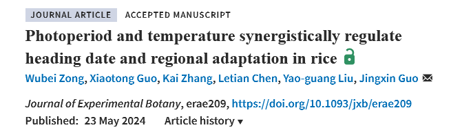 2024年5月24日,实验室刘耀光院士/郭晶心研究员课题组在Journal of Experimental Botany,在线发表了题为“Photoperiod and temperature synergistically regulate heading date and regional adaptation in rice”的综述。