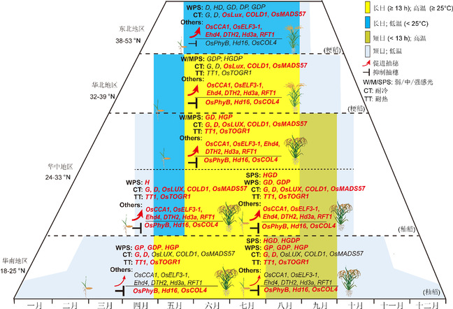 亚洲栽培稻包括籼稻和粳稻两个亚种,经长期的人工驯化,在中国形成了以秦岭和淮河为界南籼北粳的种植格局。研究发现,为适应外界的光温环境,籼粳间的抽穗期基因存在丰富的等位基因变异。论文介绍了同时响应光温信号的重要抽穗期基因:OsPhyB、OsFKF1、OsGI、OsCCA1、OsELF3-1、OsLUX、Hd1、Ghd7、DTH8、PRR37、Ehd4、OsCOL4、Hd6、DTH2、Ehd1、Hd3a和RFT1,说明温度信号部分通过光周期途径调控开花时间。