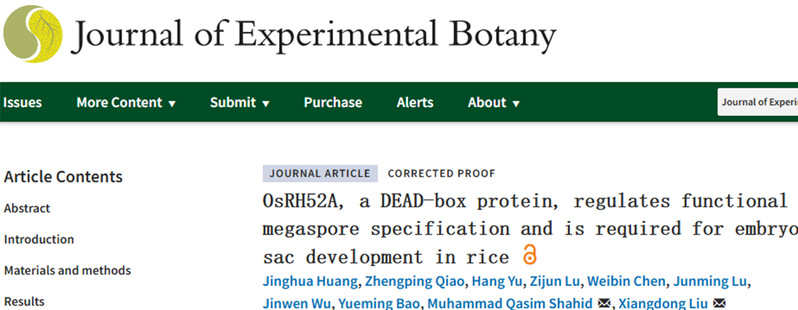 近日,实验室刘向东团队在“Journal of Experimental Botany”在线发表了题为“OsRH52A, a DEAD-Box protein, is required for embryo sac development by regulating functional megaspore specification in rice”的研究论文,揭示了DEAD-box RNA解旋酶蛋白OsRH52A在调控水稻胚囊育性具有重要的作用。