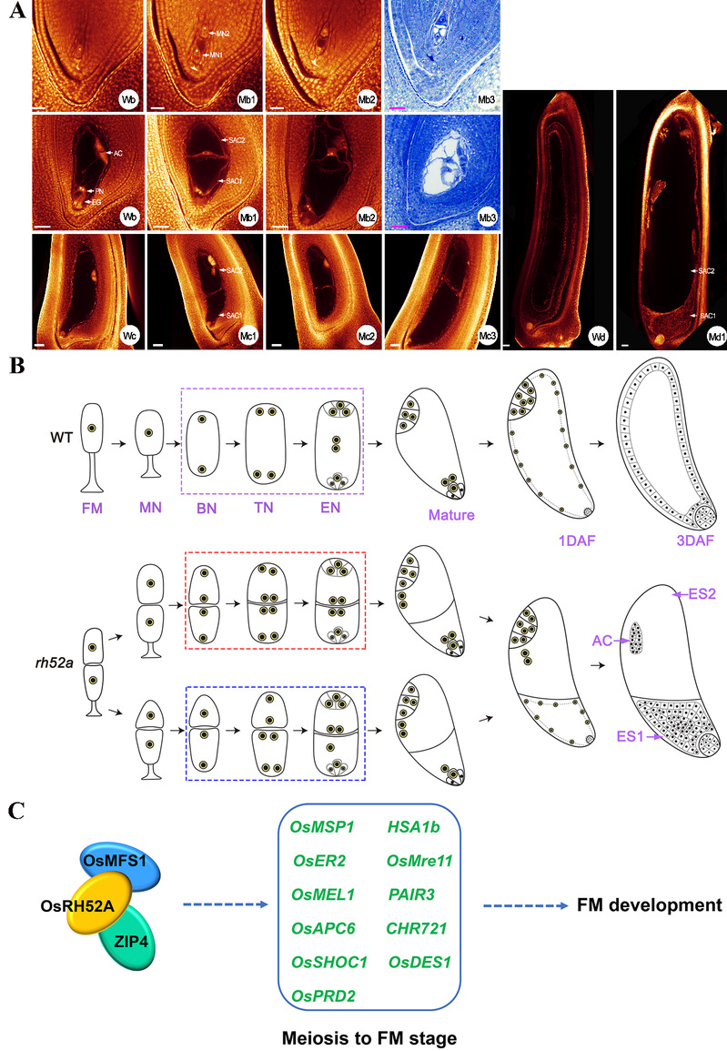 图1. OsRH52A基因突变体出现双套胚囊的发育过程及可能的分子调控机理