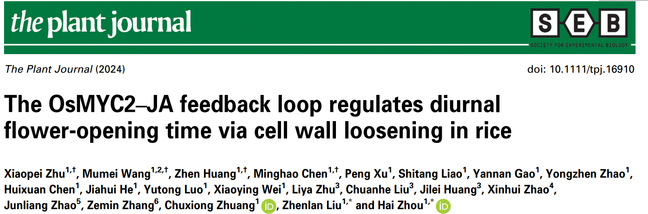 实验室周海/庄楚雄/刘振兰团队继前不久在Plant Biotechnology Journal上发表关于利用茉莉酸(JA)途径改造水稻日间开花时间(花时)论文后,近日,又在The Plant Journal上发表了题为“The OsMYC2–JA feedback loop regulates diurnal flower-opening time via cell wall loosening in rice”的论文,揭示JA调控水稻花时新机制。