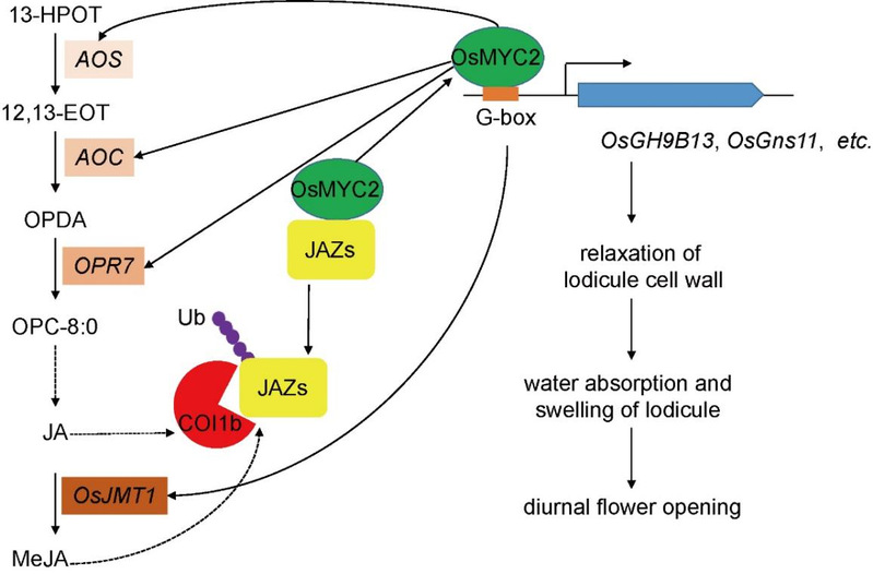 前期发现,茉莉酸(JA)可以促进JA信号抑制因子OsJAZ9的降解,敲除OsJAZ9可以让粳稻提前1.5小时开花(Wang et al., 2024)。本研究发现OsJAZ9可以与JA信号途径核心转录因子OsMYC2互作,可能抑制其活性。过量表达OsMYC2可以让粳稻提前1.5小时开花,同时伴随内源茉莉酸含量增加。进一步的研究发现,OsMYC2可以直接调控JA合成基因OsAOS1、OsAOC、OsOPR7等的表达,过量表达OsOPR7可以让粳稻提前1小时开花,因此,OsMYC2与JA形成一个反馈环。同时,OsMYC2也可以直接调控细胞壁松弛基因OsGH9B13和OsGns11等的转录。而这些基因的表达提高可能导致浆片细胞壁变的更加松弛,促进了浆片的吸水膨胀,更早的推开颖壳,使日间开花时间提前。这些结果表明OsMYC2–JA反馈回路通过细胞壁重塑来调节水稻花时。这些发现有助于理解植物日间开花时间的调控机制,从而促进适合杂交水稻育种的籼稻和粳稻品种的开发。
