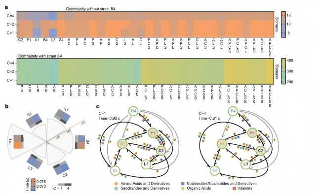 图2 合成微生物组的多环境条件模拟与互养作用分析