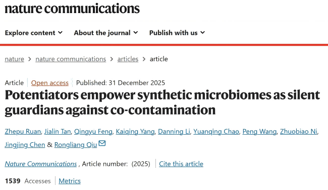 近日,实验室仇荣亮教授团队在Nature杂志子刊Nature Communications(中科院1区,5年影响因子17.2)在线发表题为“Potentiators empower synthetic microbiomes as silent guardians against co-contamination”的研究论文。该研究围绕复杂有机污染情景下合成微生物组的理性构建与功能强化,提出了一种全新的菌群设计范式,为高效、稳定的环境生物修复提供了重要理论依据与技术支撑。