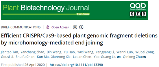 近日,华农生命科学学院、亚热带农业生物资源保护与利用国家重点实验室、岭南现代农业科学与技术广东省实验室刘耀光院士团队在国际生物技术著名期刊Plant Biotechnology Journal(IF2018=6.84)在线发表了题为“Efficient CRISPR/Cas9-based plant genomic fragment deletions by microhomology-mediated end joining”的研究论文,提出了一种利用微同源介导的末端连接(microhomology-mediated end joining,MMEJ)的修复方式促进CRISPR/Cas9的植物基因组大片段删除新策略。(论文链接地址:https://onlinelibrary.wiley.com/doi/abs/10.1111/pbi.13390)。