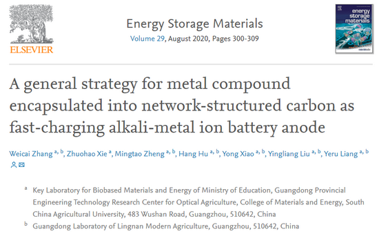 近期,华农材料与能源学院、岭南现代农业科学与技术广东省实验室、生物基材料与能源教育部重点实验室和广东省光学农业工程技术研究中心刘应亮教授带领的生物碳(炭)与光学农业团队在碳基功能复合材料研究中取得新进展,相关研究结果以“A general strategy for metal compound encapsulated into network-structured carbon as fast-charging alkali-metal ion battery anode”(论文链接:https://www.sciencedirect.com/science/article/pii/S2405829720301495?dgcid=coauthor)为题发表在国际知名学术期刊Energy Storage Materials(IF2019:16.28)。