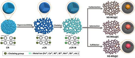 由于其独特的结构特征,碳基功能复合材料在能源储存、农业环境、石油化工和医疗卫生等领域具有重要的应用。然而,当前碳基功能复合材料通常存在碳/非碳界面结构不够精细、形貌缺乏层次化设计、活性位点少且利用率低等弊端,已日益制约其高性能化,非常不利于上述各项应用领域的进一步发展。为此,生物碳(炭)与光学农业团队从碳/非碳界面构建的源头出发,发展了一种通用的制备策略,设计合成出系列具有纳米网络结构的新型碳基功能复合材料。该策略的关键是采用了碳源−非碳前驱体一体化的螯合树脂−金属离子杂化组装体作为构筑单元,它不仅可在分子水平上实现均一的有机/无机界面,还使金属离子在高温过程中转化成金属化合物纳米颗粒(例如,金属氧化物、金属硒化物、金属硫化物)并原位封装在碳纳米网络单元中。进一步研究发现,得益于其具有快速输运通道的层次孔结构和发达活性位点的复合骨架,所得到的碳基功能复合材料可用作快充型碱金属离子电池负极材料,表现出较优异的可逆充放电容量、高倍率性能以及长循环寿命。