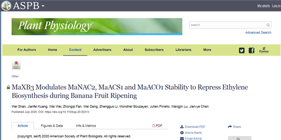 日前,华南农业大学亚热带农业生物资源保护与利用国家重点实验室、岭南现代农业科学与技术广东省实验室、园艺学院陈建业教授与陆旺金教授课题组,在国际知名植物学TOP期刊Plant Physiology(IF5-y = 7.52)在线发表了题为“MaXB3 Modulates MaNAC2, MaACS1 and MaACO1 Stability to Repress Ethylene Biosynthesis during Banana Fruit Ripening”的研究论文(论文在线链接网址: http://www.plantphysiol.org/content/early/2020/07/21/pp.20.00313)。该论文解析了E3泛素连接酶MaXB3调控采后香蕉果实成熟的分子机制,论文第一作者为单伟博士,论文通讯作者为陈建业教授。