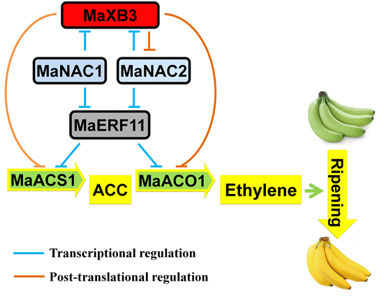 香蕉是我国五大水果之一。为了方便从生产地运输到销售地,商业生产上一般是在七至八成饱满度的青果期采收香蕉果实,需要经过采后成熟过程才能达到可食状态,后熟过程决定香蕉果实品质形成。然而,香蕉是典型的呼吸跃变型果实,果实成熟启动后衰老进程迅速加快,导致货架期短,严重影响香蕉的保鲜和物流,给香蕉产业带来较大损失。陈建业与陆旺金课题组十多年来一直致力于香蕉果实采后生物学的研究,阐明了MaNAC1/2(Shan et al., 2012, Journal of Experimental Botany, 63:5171-5187),MaERF9/11(Xiao et al., 2013, Journal of Experimental Botany, 64:2499-2510; Han et al., 2016, Plant Physiology, 171:1070-1084),MaDof23(Feng et al., 2016, Journal of Experimental Botany, 67:2263-2275),MaDREB2(Kuang, et al., 2017, New Phytologist, 214:762-781)、MabHLH6(Xiao et al., 2018, Plant Biotechnology Journal, 16:151-164)和MaMYB3(Fan et al., 2018, Plant Journal, 96:1191-1205)等转录因子在香蕉成熟和品质形成过程中的调控机制。本研究进一步以MaNAC2为钓饵,通过酵母双杂交筛选,鉴定到一个E3泛素连接酶-MaXB3。MaXB3通过介导MaNAC2泛素化降解,抑制MaNAC2对下游成熟相关转录因子MaERF11的调控。同时,MaXB3与乙烯合成关键酶MaACS1和MaACO1互作,并介导其通过泛素-蛋白酶体途径降解。将MaXB3分别在香蕉果实瞬时和番茄中稳定超表达进行功能验证,发现过表达MaXB3可以通过抑制乙稀合成和乙烯反应来延缓果实成熟。此外,MaNAC1/2也直接抑制MaXB3的表达,反馈调节MaNAC2,MaACS1和MaACO1的蛋白稳定性。围绕E3泛素连接酶MaXB3,我们的研究结果构建了一条涉及MaXB3, MaNACs, MaERF11和MaACS1/MaACO1的级联调控模式,该模式通过调控乙稀合成参与香蕉果实成熟。该研究从转录水平和翻译后水平为果实成熟调控的机制提供了新观点,同时也为生产上改进和研发采后香蕉果实品质调控技术措施奠定了理论基础。