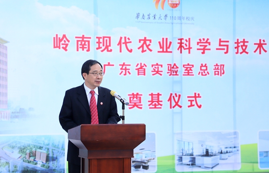 11月10日上午,岭南现代农业科学与技术广东省实验室(总部)在中衡山举行奠基仪式。广东省人民政府副秘书长郑伟仪,广东省农业农村厅厅长顾幸伟,广州市人民政府副市长黎明,校领导王斌伟、刘雅红、廖明、杨运东,罗锡文院士、刘耀光院士出席奠基仪式。仪式由廖明副校长主持。